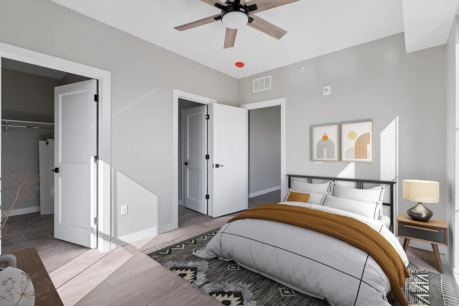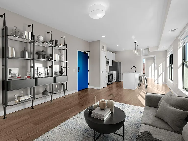 a 3d rendering of a one bedroom apartment at Fuller Park Flats